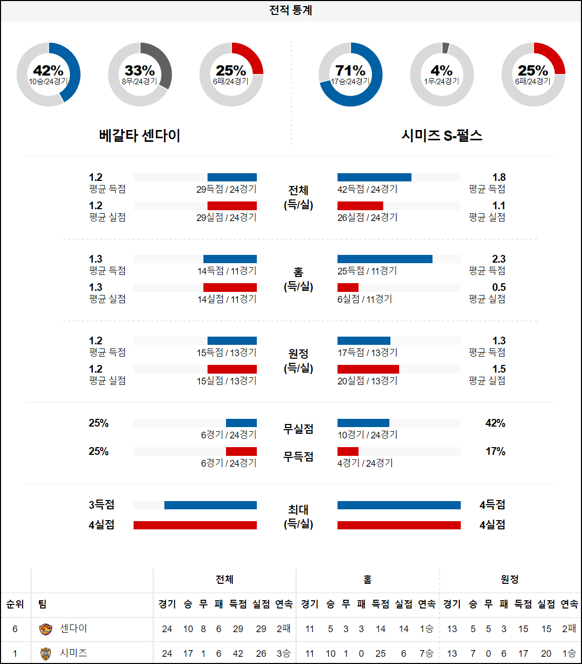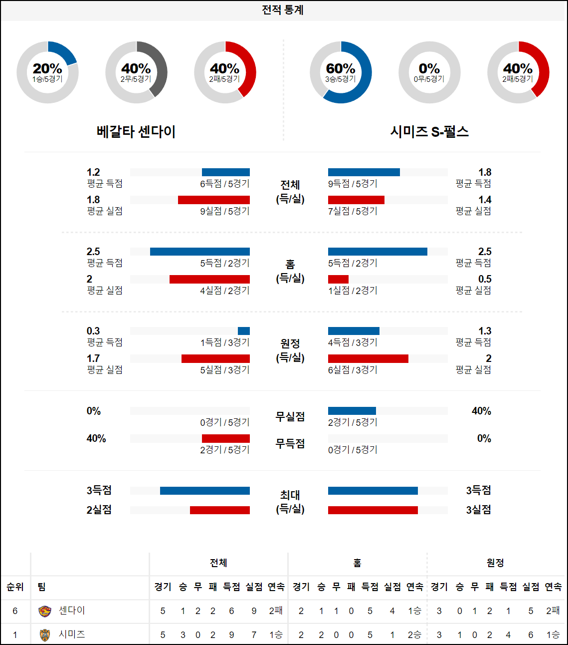 시미즈가 경기를 주도하는 것은 예상되지만, 센다이의 밀집 수비를 상대로 최전방의 부진으로 인해 고전할 가능성이 있다. 그럼에도 불구하고 시미즈는 2선 자원과 풀백 자원들의 지속적인 침투와 연계 플레이를 통해 득점을 만들어낼 것으로 보인다. 따라서 시미즈의 승리가 유력하고, 언더(2.5 기준) 가능성도 있으며, 핸디캡(+1.0 기준) 무승부도 고려해 볼 만하다.