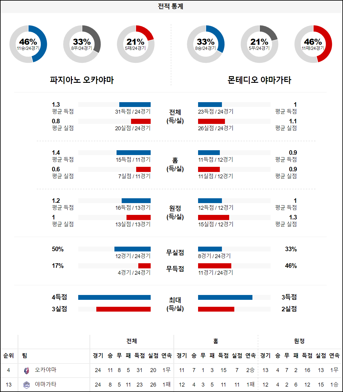 야마가타는 플레이가 불안한 면모가 있다. 특히 높은 점유와 라인을 구축하고 있음에도, 찬스메이킹이 아주 뛰어난 편은 아니다. 올 시즌 J리그2에서도 득점력은 0점대를 기록하고 있는 상황. GK의 세이브 능력이 좋아서 높은 라인을 커버하는 것이 아예 안되는 상황은 아닌데, 오카야마의 라인 간격을 야마가타가 충실히 공략할 수 있을지는 의문스럽긴 하다.