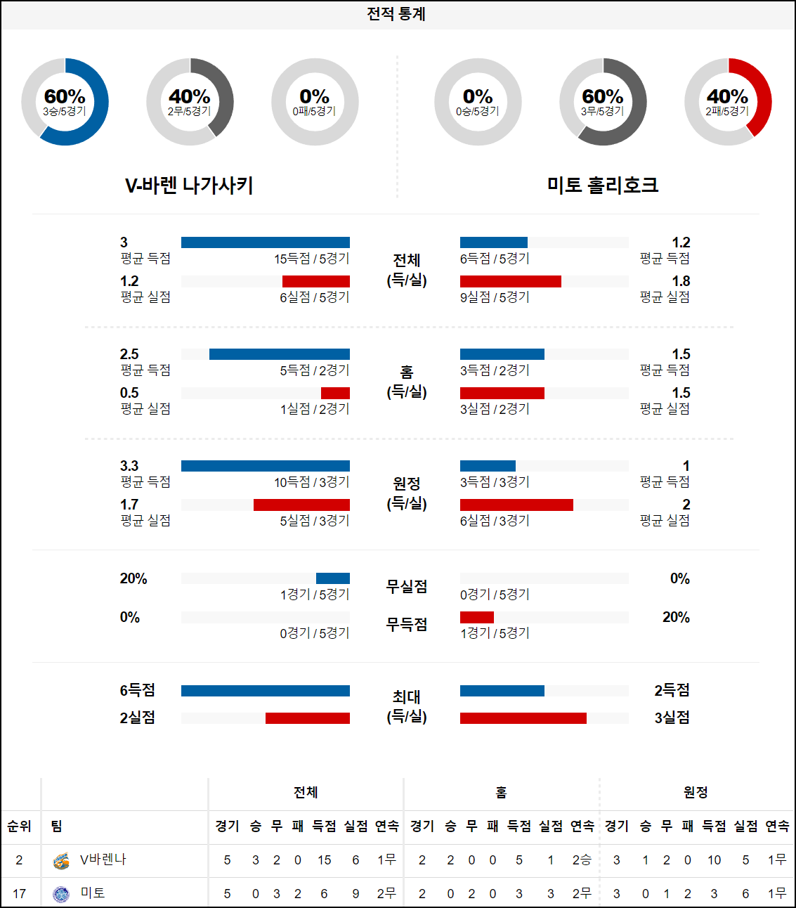 나가사키는 대체적으로 유연하게 공격과 수비를 넘나들면서 상대를 공략하는 성향을 보이는 편이다. 일단 나가사키가 최근 미토가 보여주는 공격력을 부담스러워할 이유는 충분한 상태. 물론 나가사키도 수비적으로 안정성이 강한 전력이기는 하지만, 미토가 압박을 뚫고 골문을 공략하는 데 약한 전력이라고 하기는 어렵다. 물론 나가사키의 경우도 미토를 상대로 다득점 상황을 만드는 데 능한 편인데, 최근 세 번의 대결에서 기록한 골은 10골이다.